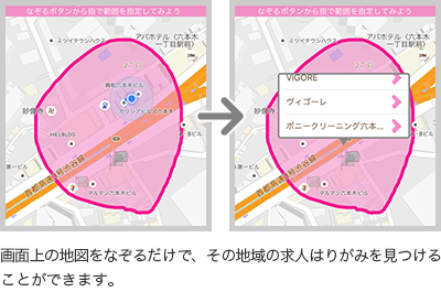 そこで、「地図からなぞって探す」が、「ぽけじょぶ」の大きな機能となりました。地図から探せるため、ユーザーは単純な路線検索では行えなかった、「このあたり」という微妙な場所での検索ができるようになります。この「なぞって探す」により、求人情報が見つけやすくなるだけでなく、「なぞること」のインタラクションが求人アプリにはない、新しい楽しさを生みました。
