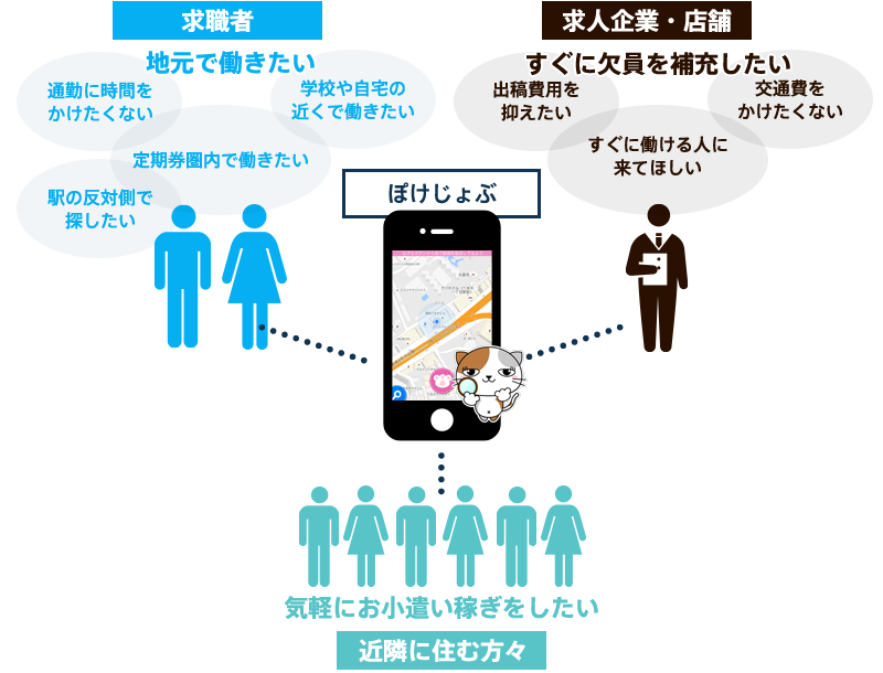 求職者にとっては自分の生活圏にマッチした仕事探しができ、企業にとっては出稿費用がなくても求人の募集がかけられるもので、ポケットに求人情報(仕事)を気軽に・簡単に持ち運べる、というイメージから、サービス名も「ぽけじょぶ」と命名されました。