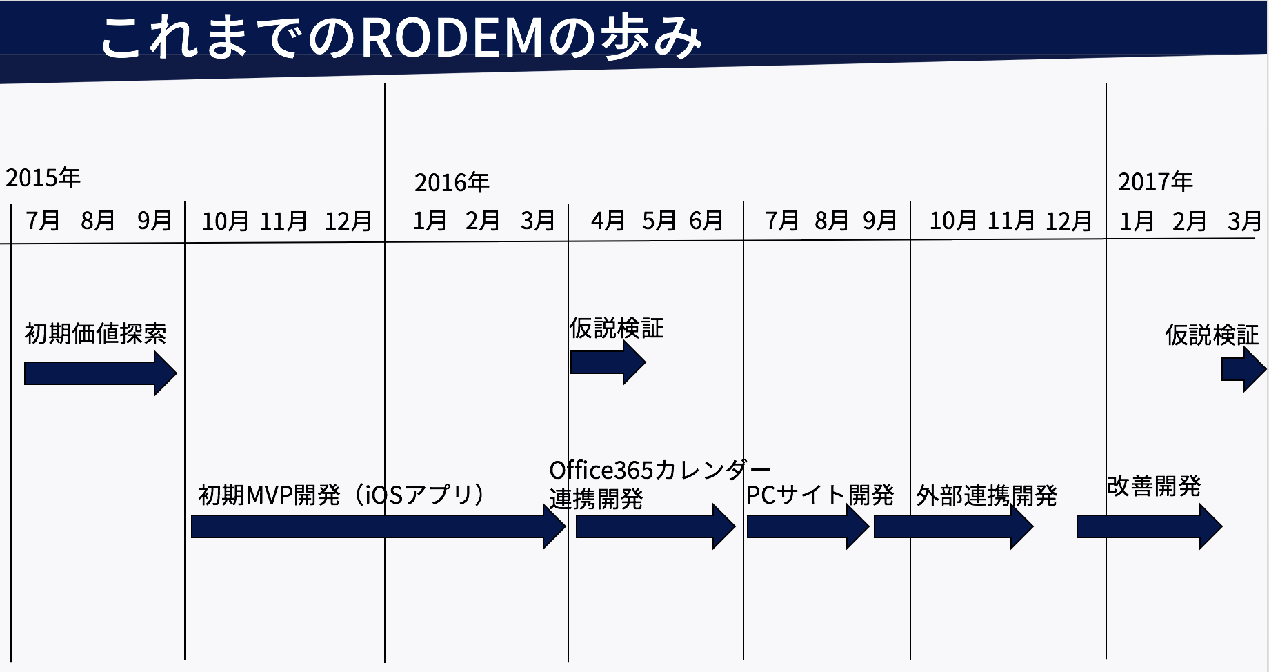価値探索や仮説検証の結果を踏まえてMVP(Minimum Viable Product)を開発したところ、スマホ向けアプリではなく、カレンダーとの連携を強化したWeb主体のサービスに市場性があるとの結論に至りました。結果的にスマホ向けアプリは世に出ませんでしたが、この方針転換がなければ「RODEM」を製品化できなかったでしょうし、MVPがあったからこそ連携先を探して企業訪問できたので、アプリ開発は無駄ではなかったと思います。