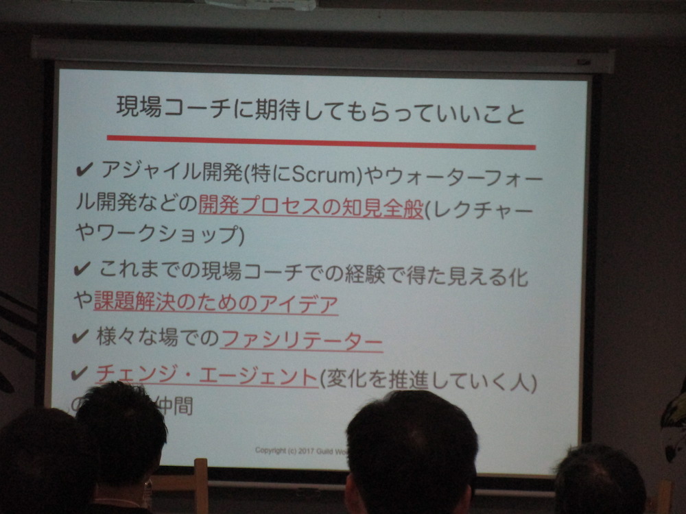 事業会社を中心に定期的に3~4社のコーチをしている中村から、現場コーチが現場支援をする際にどのようなことを考え、どのようなことをしているのかをお話ししました。