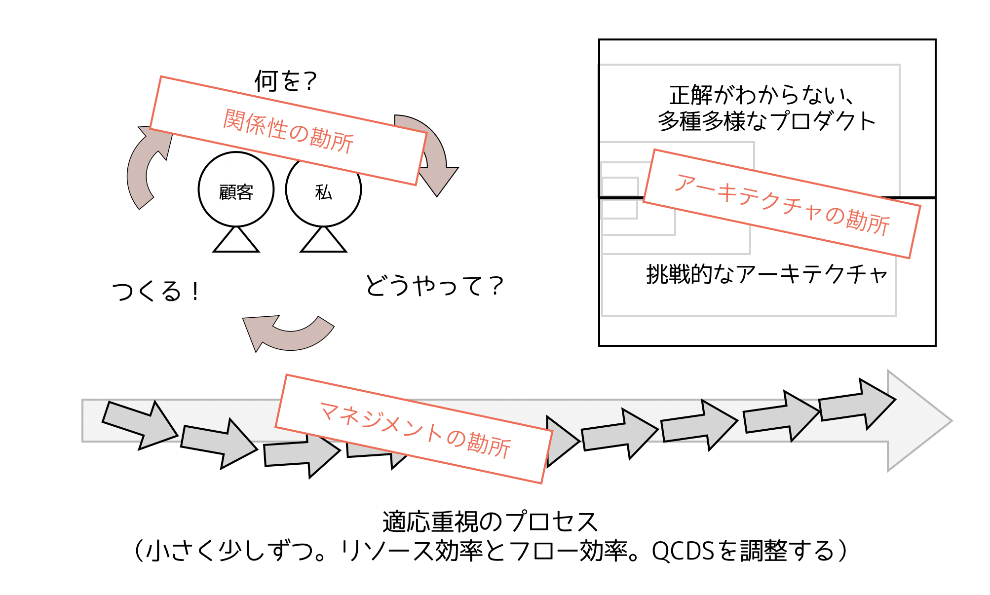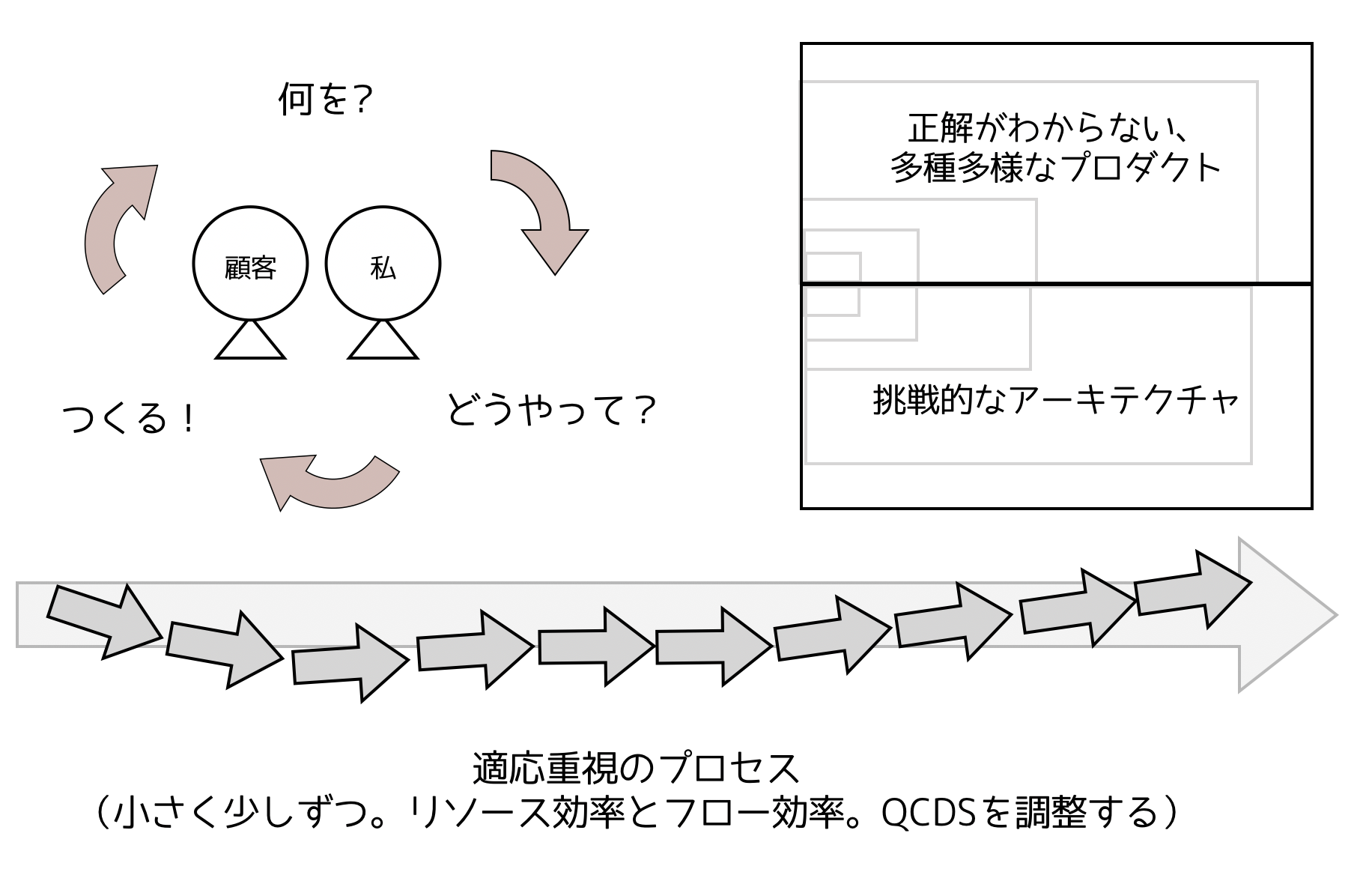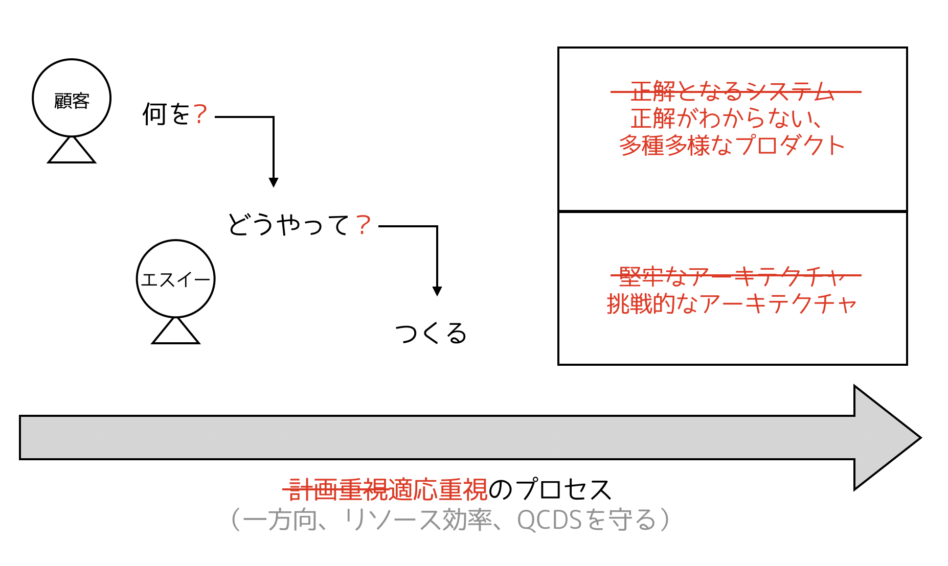 時が流れて、ITを最大限に活用して、既存の事業を見直したり、新たな事業を立ち上げるといったこと求められてきました。すると、クライアントですら正解がわからない多様なプロダクトを、新しいアーキテクチャで構築するといったことが必要になり、事前に計画しきることは難しくなります。