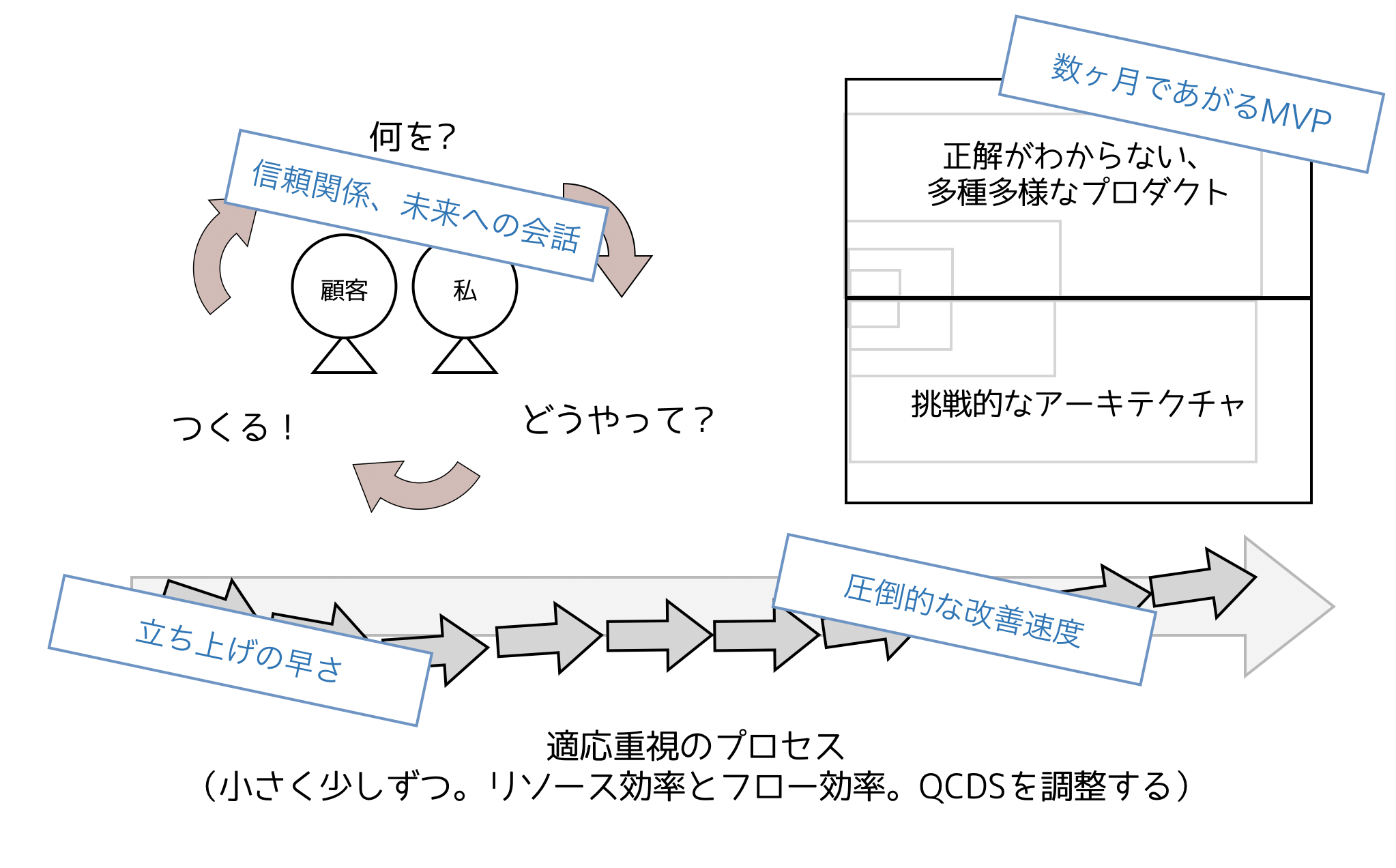 そこでは、チームは即座に立ち上がって、圧倒的な速度でカイゼンを繰り返しながら、数ヶ月でプロダクトが世に送り出されます。また、契約で縛られ目先のプロジェクトの会話をするのではなく、信頼で繋がり、プロダクトの未来について語り合う関係があります。
