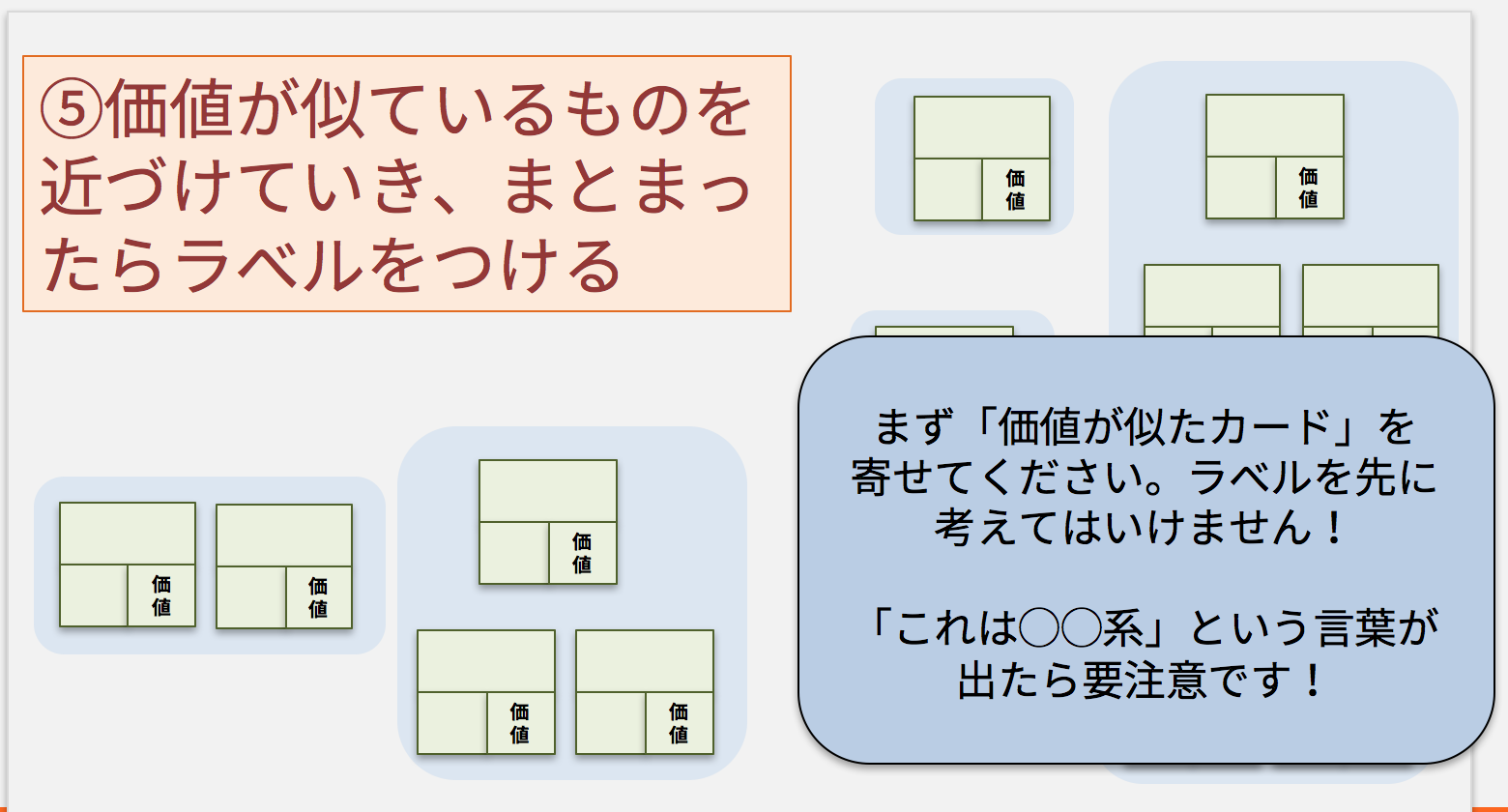 2. 抽出した生活価値に着目して、似ているものを近づけていき、そこに適切なラベルをつける(いわゆる KJ法 の手順です)