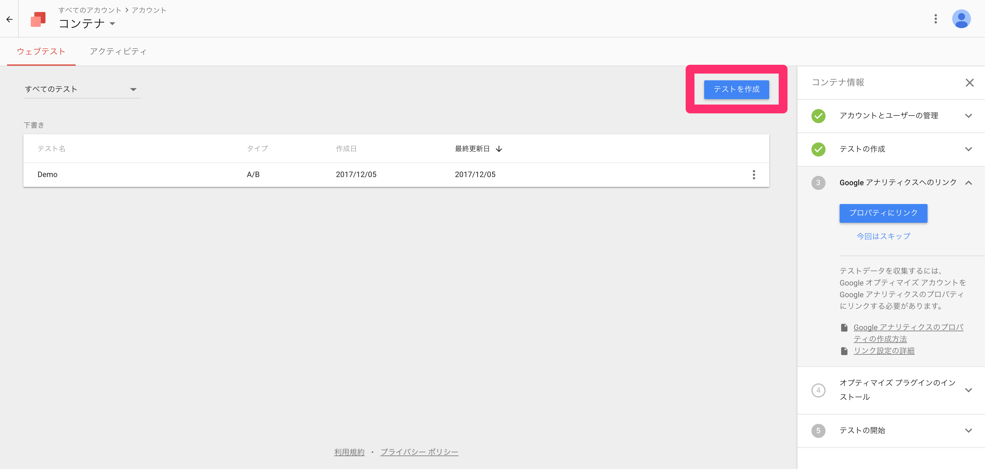 「テストを作成」ボタンをクリックし、A/Bテストを作成します。