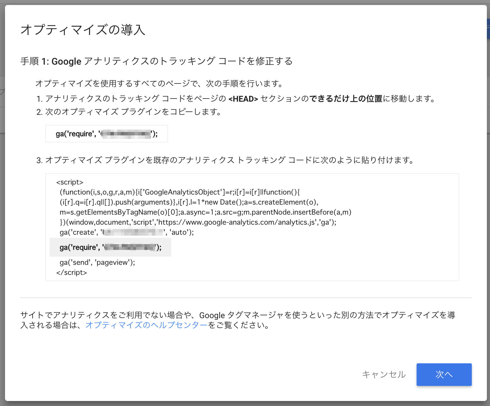 ※ GOOGLE_OPTIMIZE_PLUGIN_ID のところは、上記でコピーしたオプティマイズプラグインの文字列で置き換えて下さい。