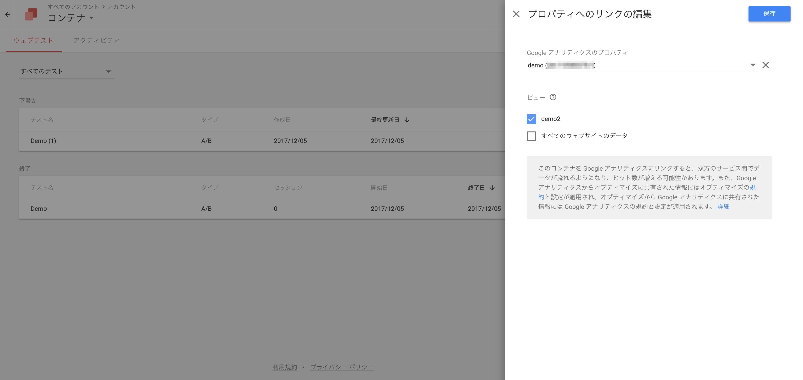 Googleアナリティクスのプロパティ・ビューを選択します。ここで選択したビューの目標をA/Bテストの目的とするため、最適化したい目標を設定しているビューを選択します。