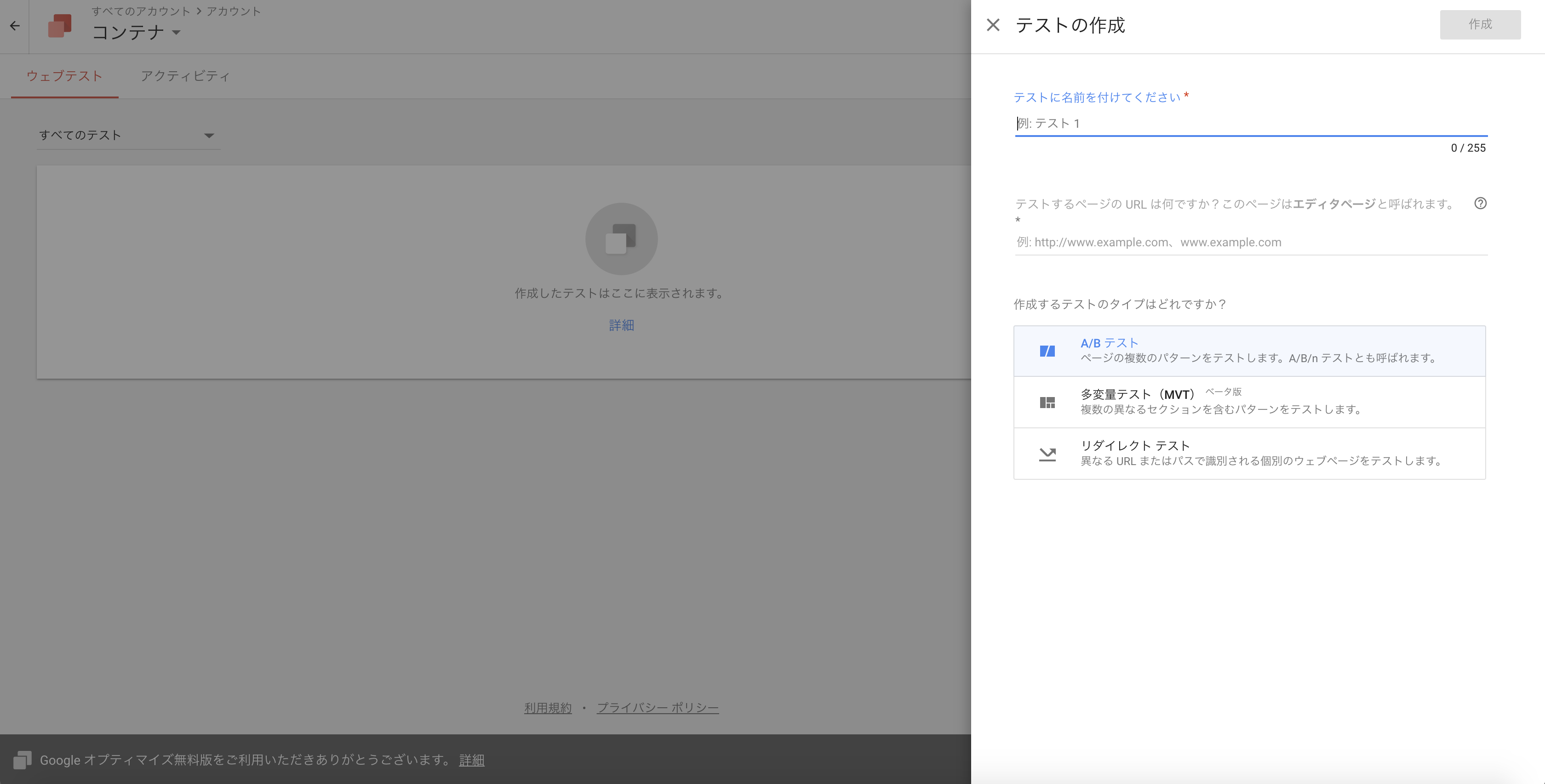 次に、「テスト名」、「テスト対象ページ」、「テストの種類」の3つの項目を入力・選択します。