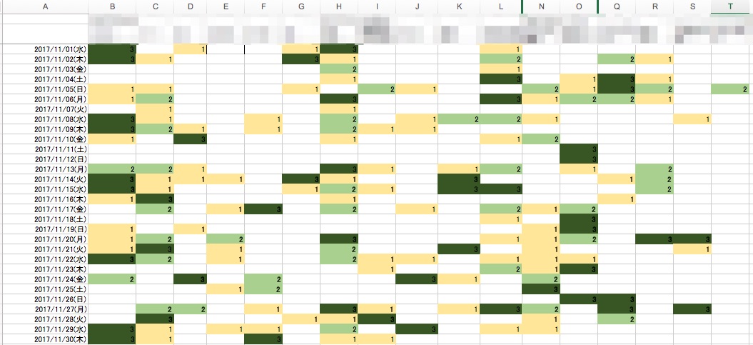 この記事は、 ギルドワークス アドベントカレンダー の18日目の記事です。今回は、「色つき星取表」を紹介します。 「色つき星取表」ってなに? 結城浩さんが紹介されている自分の活動を見える化するやり方の1つです。 最近の自分がどんな活動に力を…