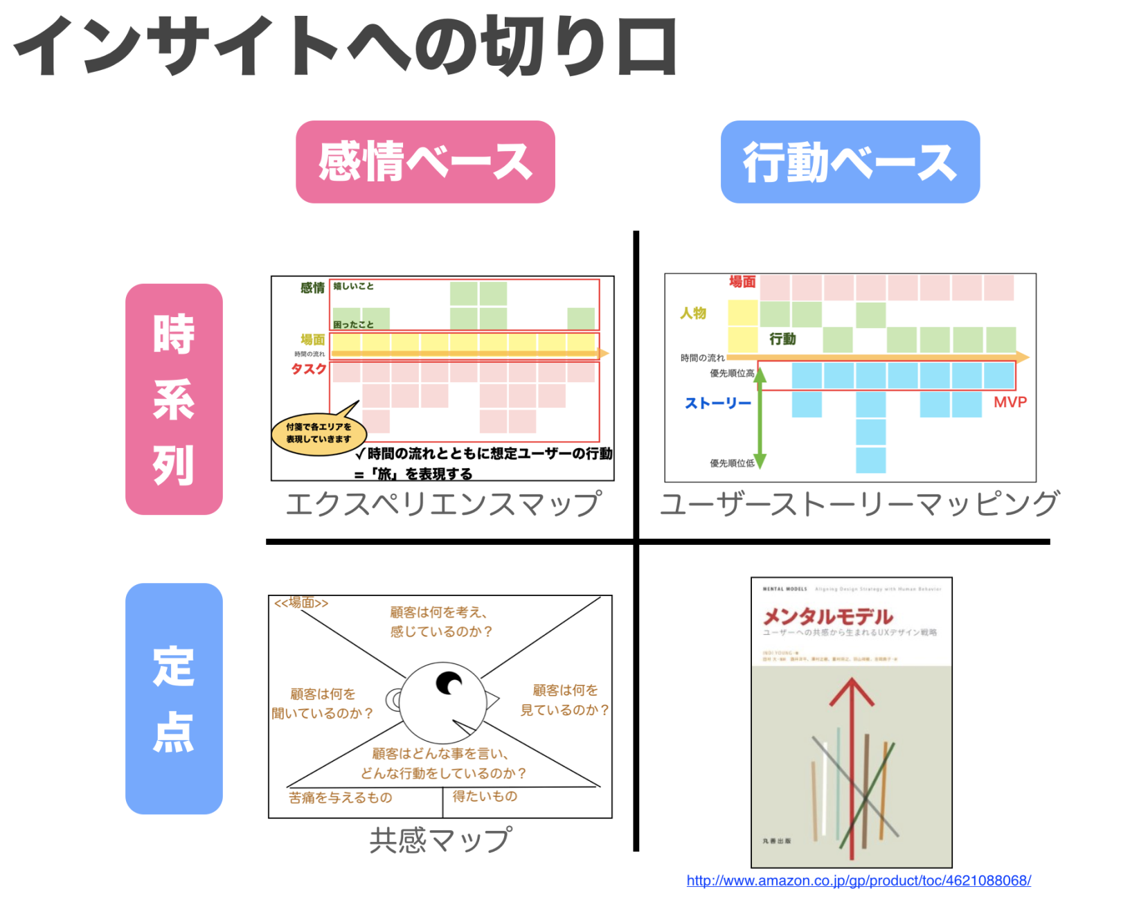 市谷です。 想定しているユーザーが何を求めるのか、ユーザーの立場に踏み込むための道具がいくつかあります。今回はGWで利用している道具立てをいくつかの切り口で分類してみます。 切り口は「ユーザーの感情ベースか、行動ベースで捉えるのか」また「時…