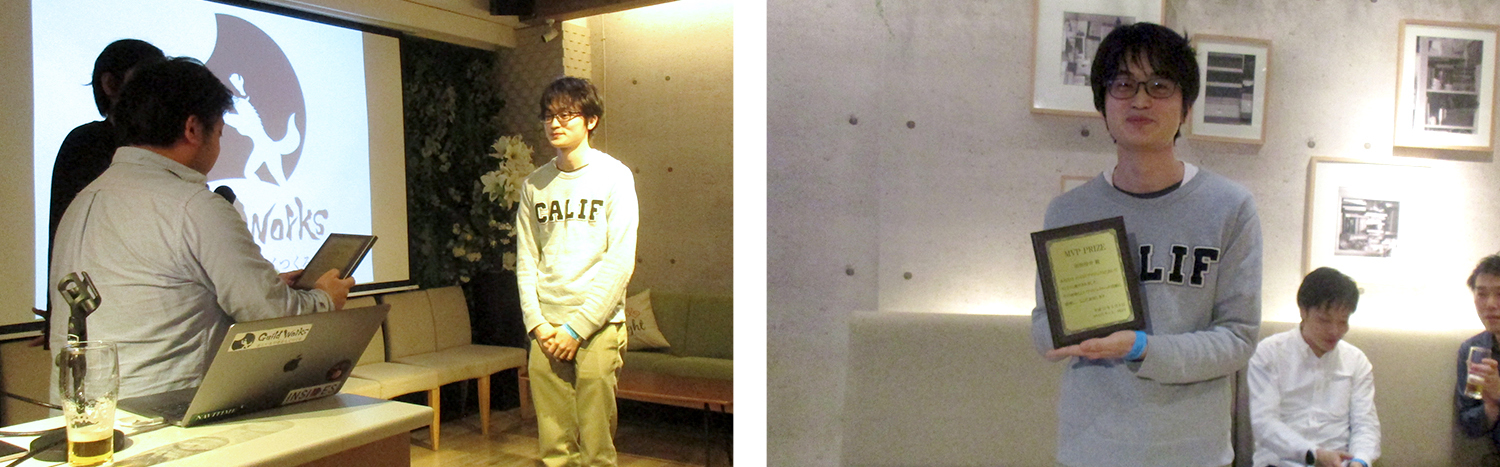 去年3月にローンチしたプロジェクトでチームメンバーの投票によりMVPに選ばれた、沼田佳介さん(プログラマー)に、ギルドワークス前川から表彰の盾をお渡ししました。